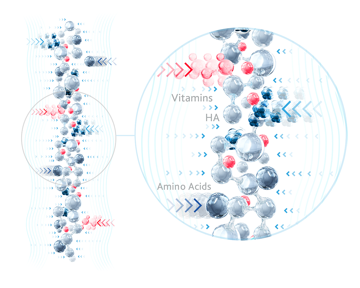 Integration of active components into the structure of the HA “matrix” under the influence of pressure and shear deformation with the formation of links between HA molecules and active components (amino acids, vitamins and oligo-elements).